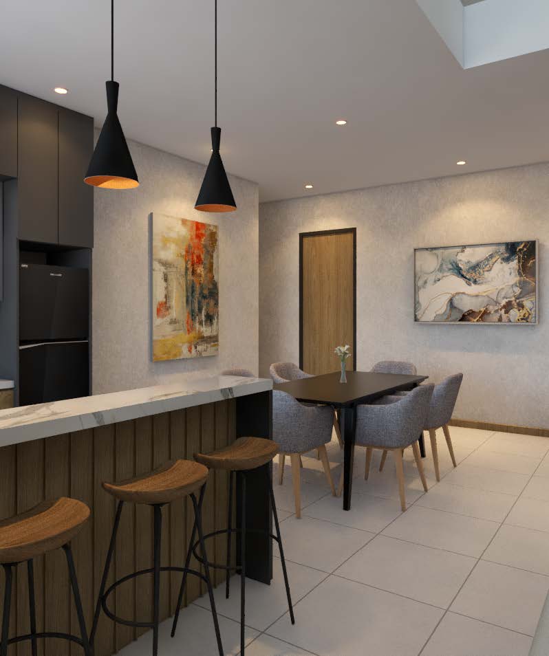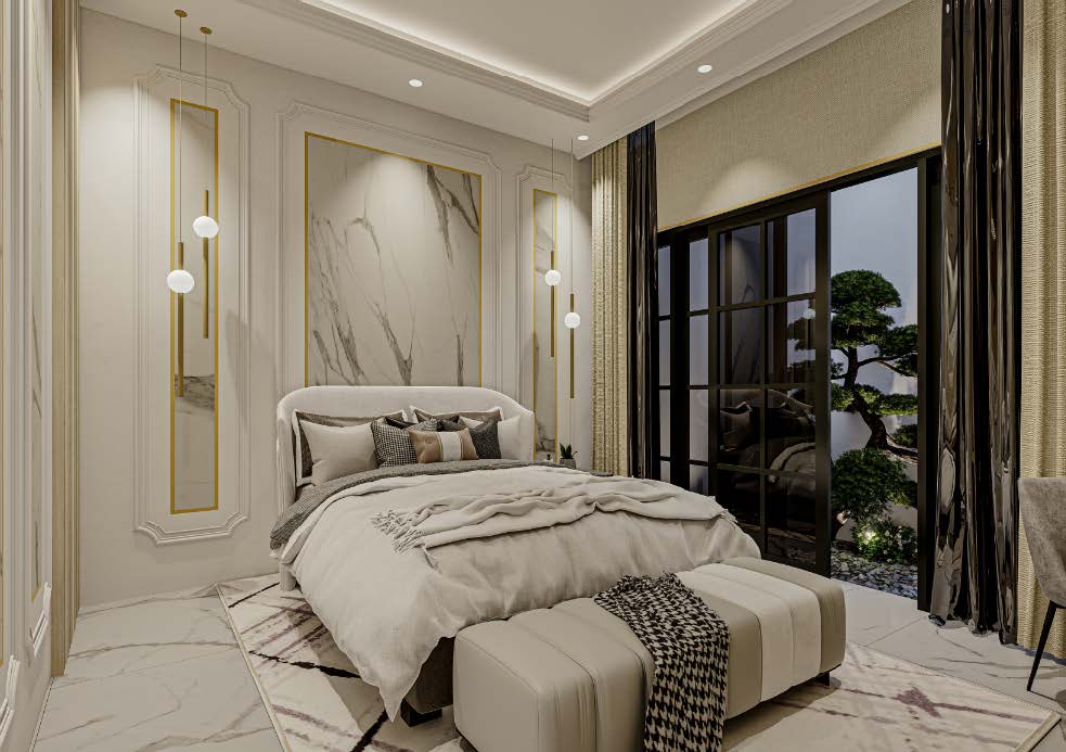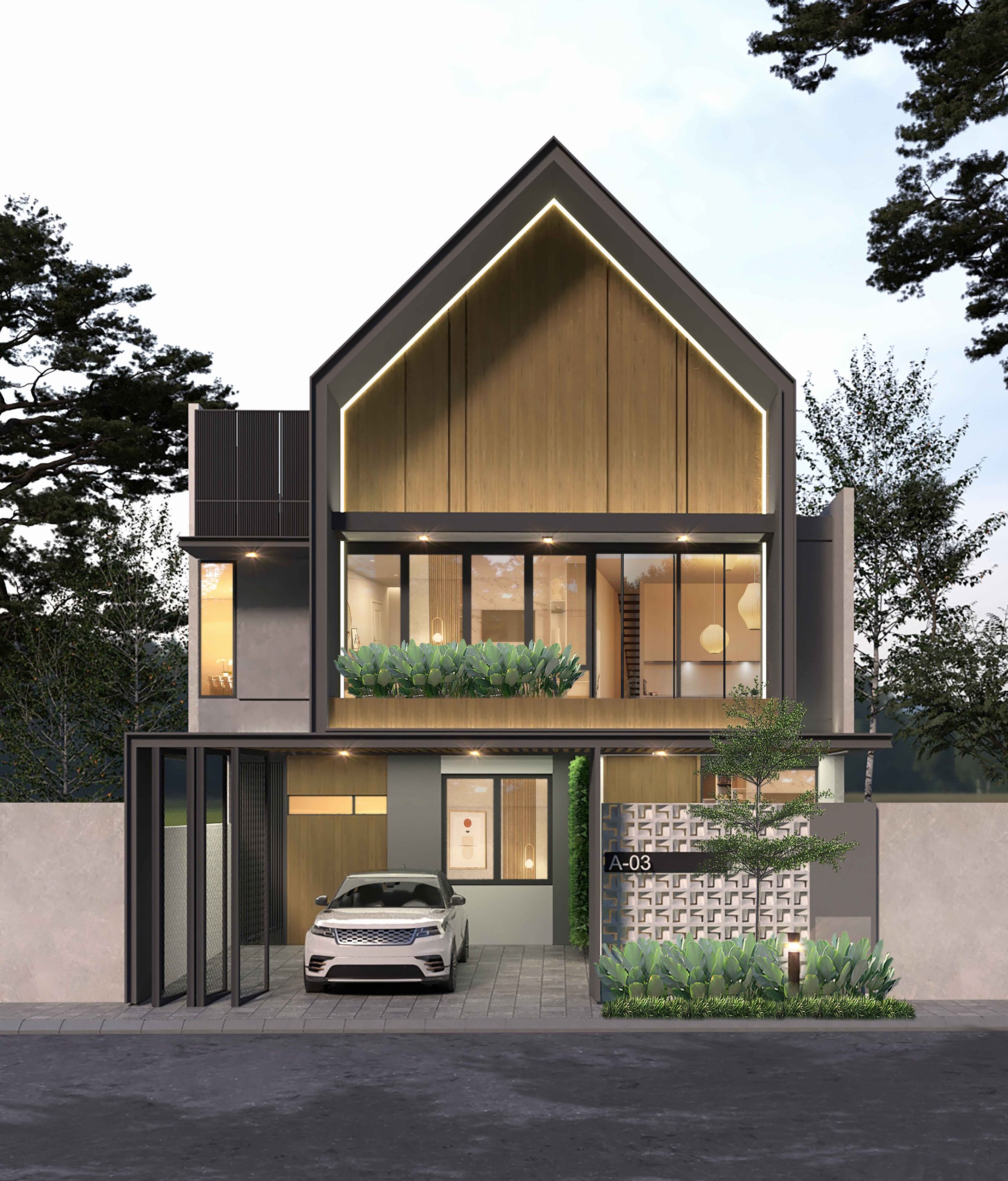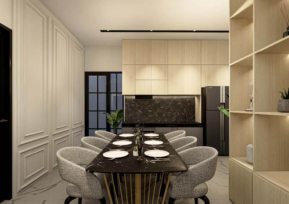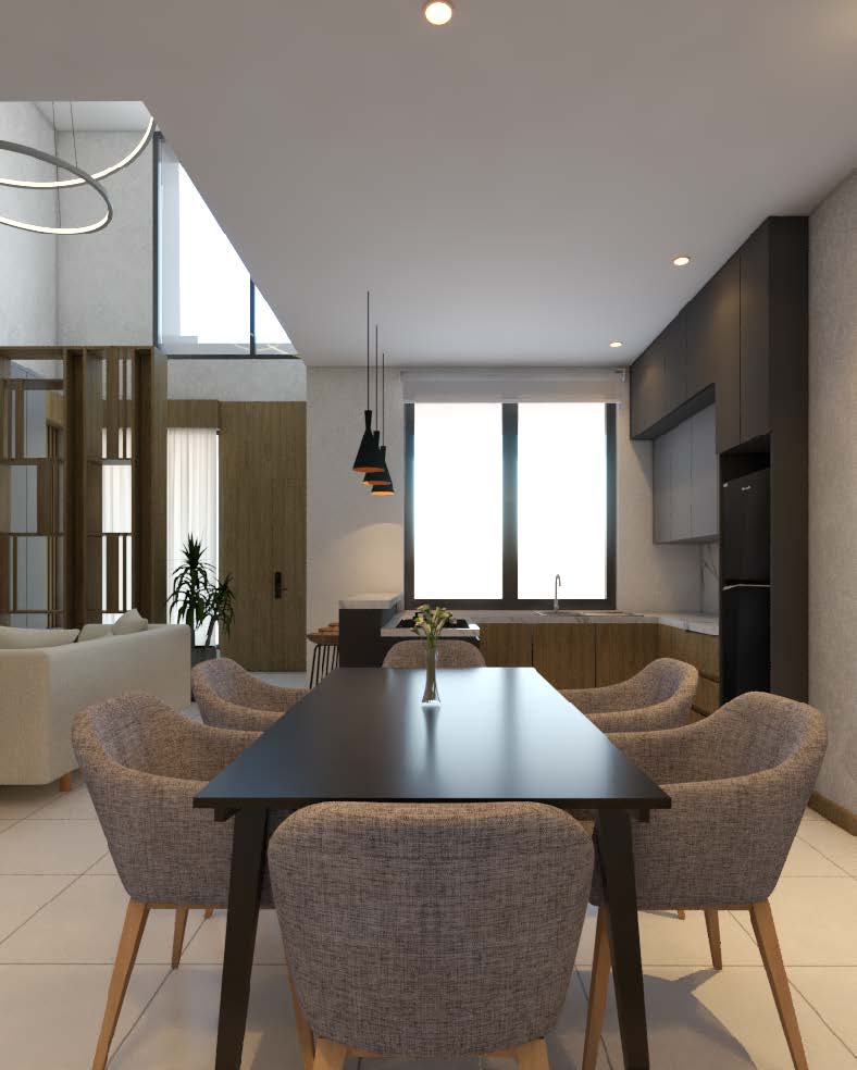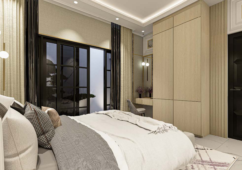 Interior spaces are carefully planned to support comfort and spatial efficiency, including a Japandi-style master bedroom with an integrated walk-in closet. Key spaces such as the foyer, family area, and internal garden are designed to enhance natural ventilation, daylighting, and spatial openness. The house also includes a functional U-shaped kitchen with a mini island and a dedicated workspace to support daily living activities.