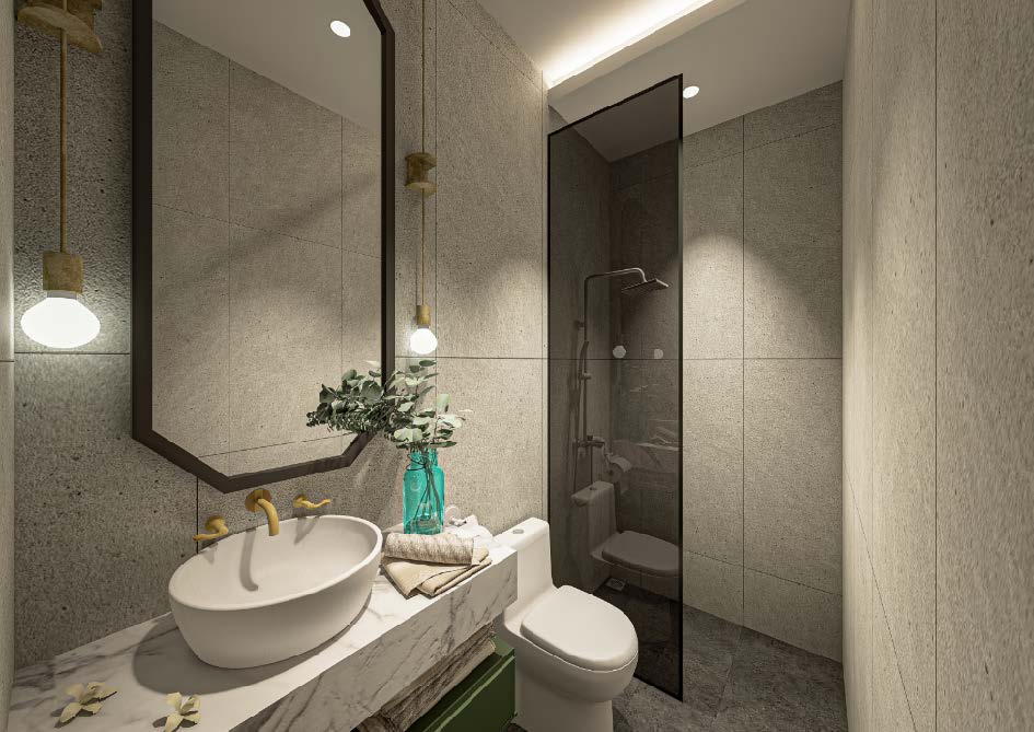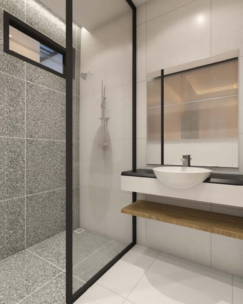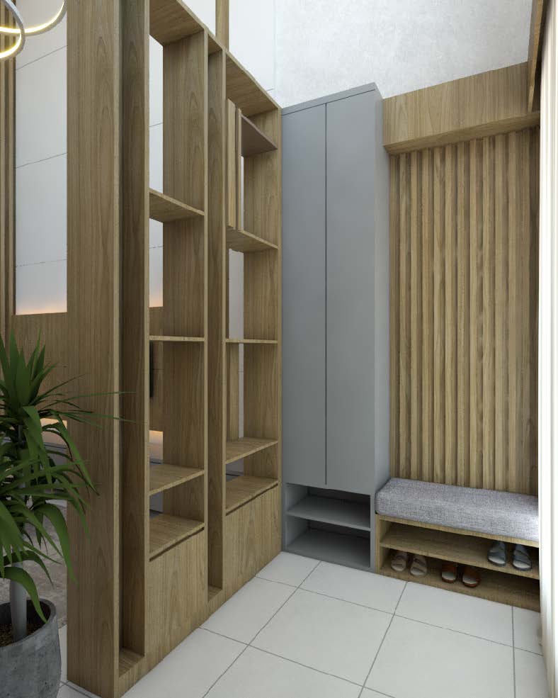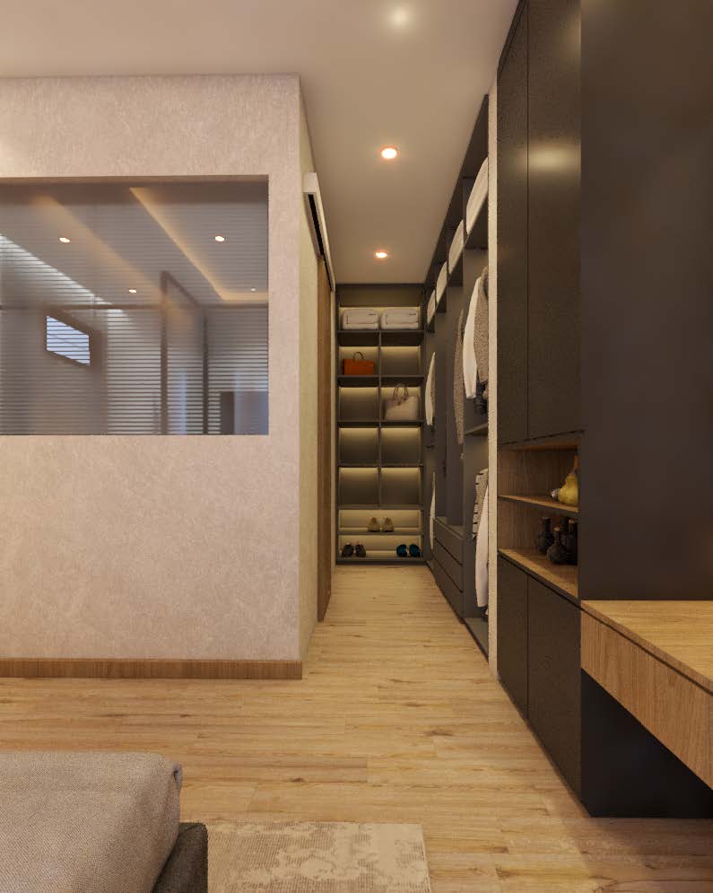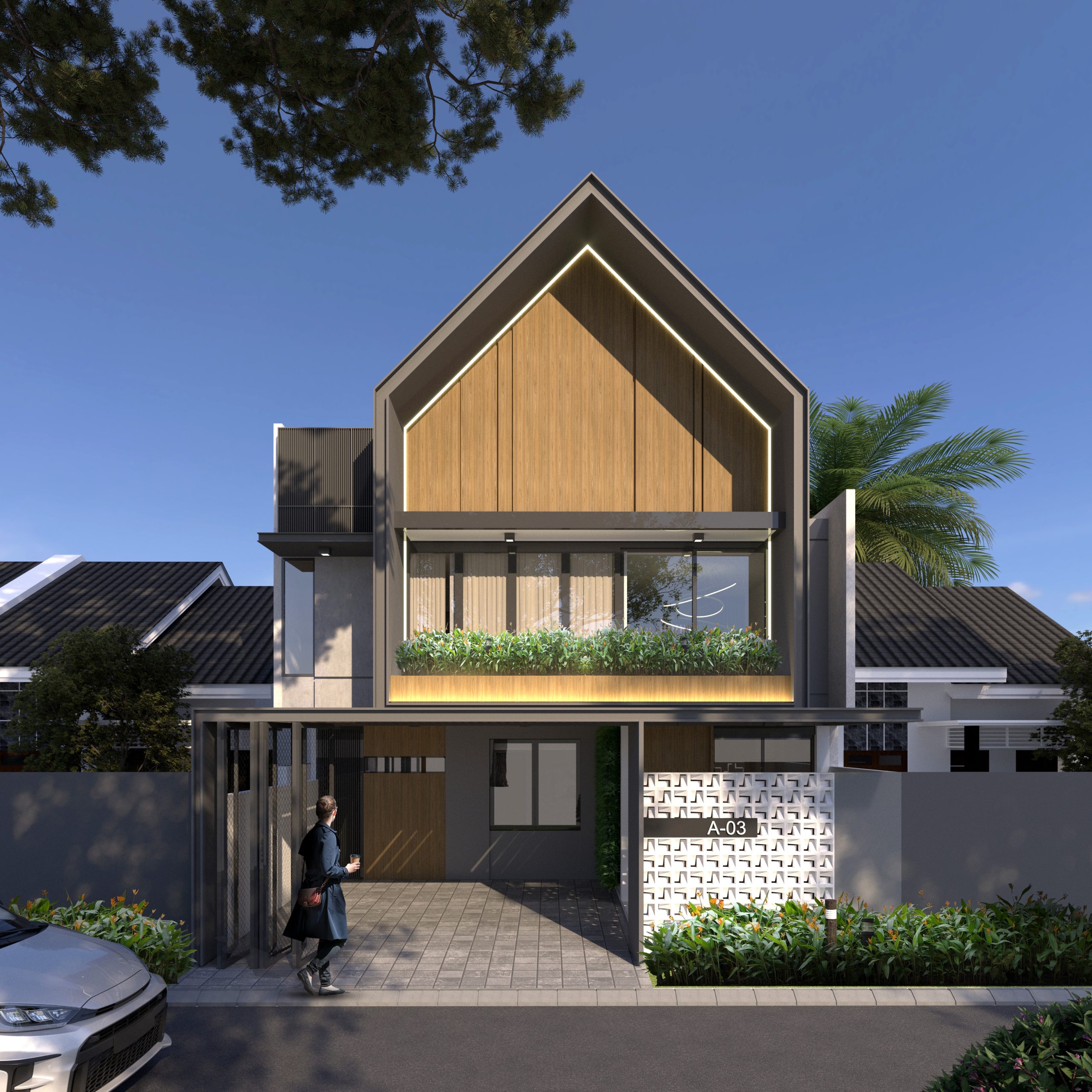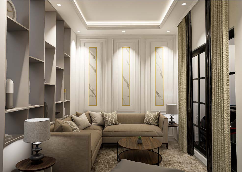 Interior spaces are carefully planned to support comfort and spatial efficiency, including a Japandi-style master bedroom with an integrated walk-in closet. Key spaces such as the foyer, family area, and internal garden are designed to enhance natural ventilation, daylighting, and spatial openness. The house also includes a functional U-shaped kitchen with a mini island and a dedicated workspace to support daily living activities.