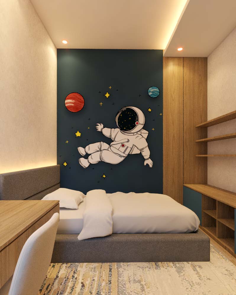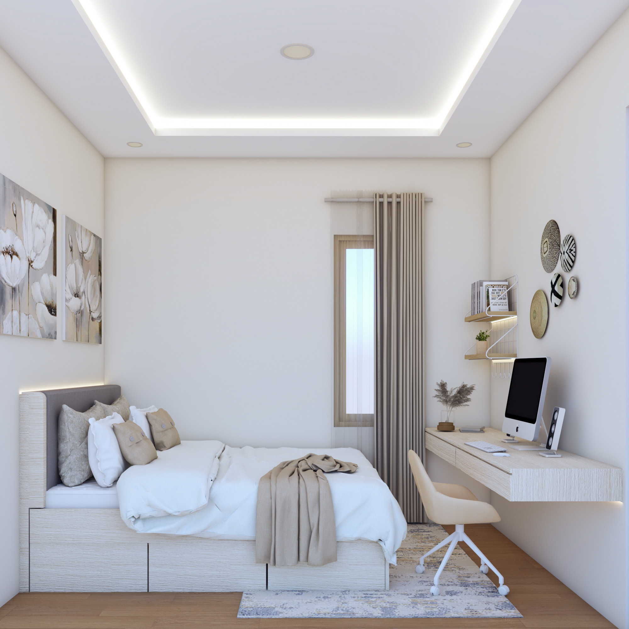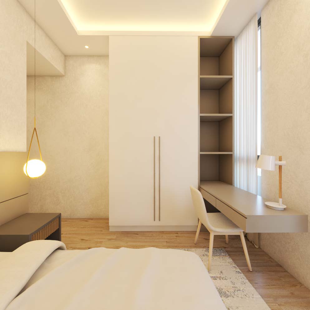 The room’s layout maximizes spatial efficiency by integrating bespoke, multi-functional furniture, such as a floating workstation and a platform bed with integrated storage. By utilizing a neutral, warm palette: creams, soft beiges, and light oak textures, the design achieves a sense of airy tranquility. The sophisticated use of layered lighting, including recessed ceiling LEDs and ambient backlighting, adds a three-dimensional depth, creating an environment that feels both expansive and intimate.