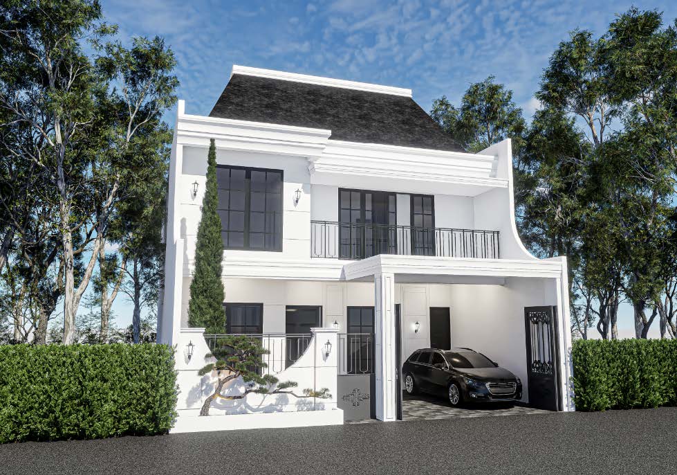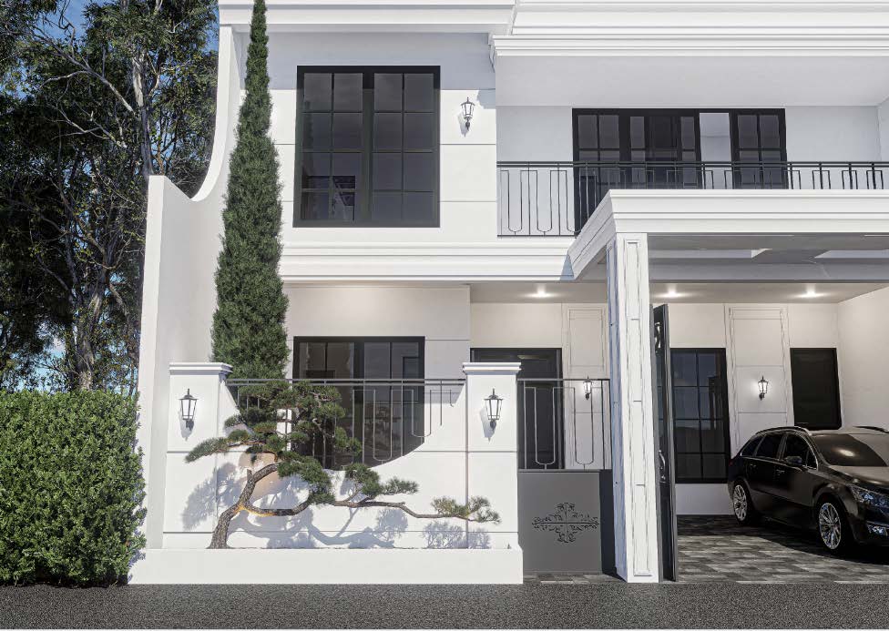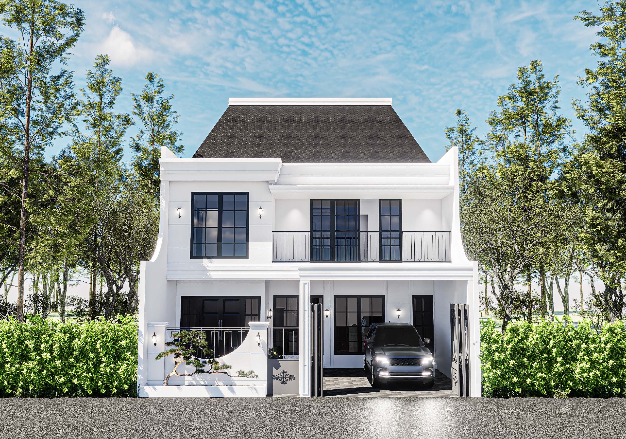 A sophisticated residential project that harmonizes Neoclassical architectural elements with a bold, contemporary interior palette. The exterior showcases a clean, white facade with symmetrical proportions and a distinct Mansard-style roof, creating a timeless and elegant street presence.
