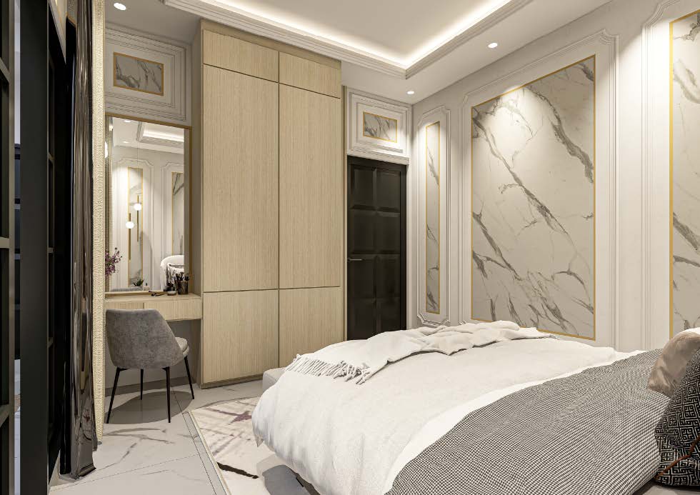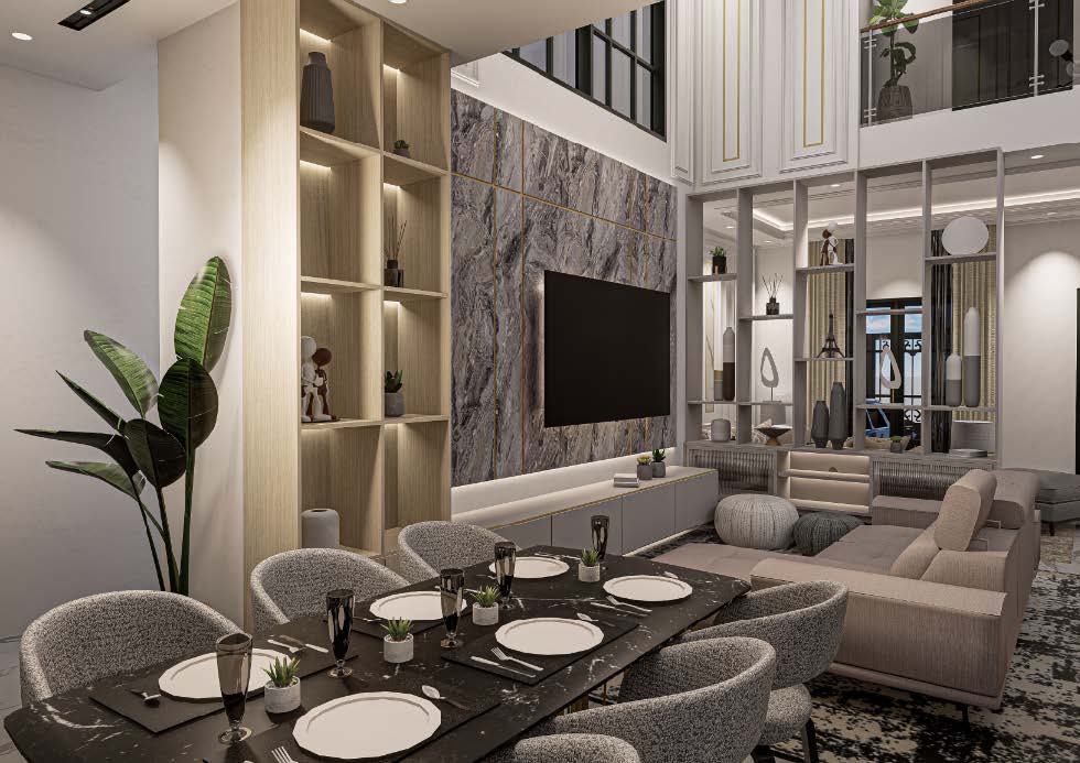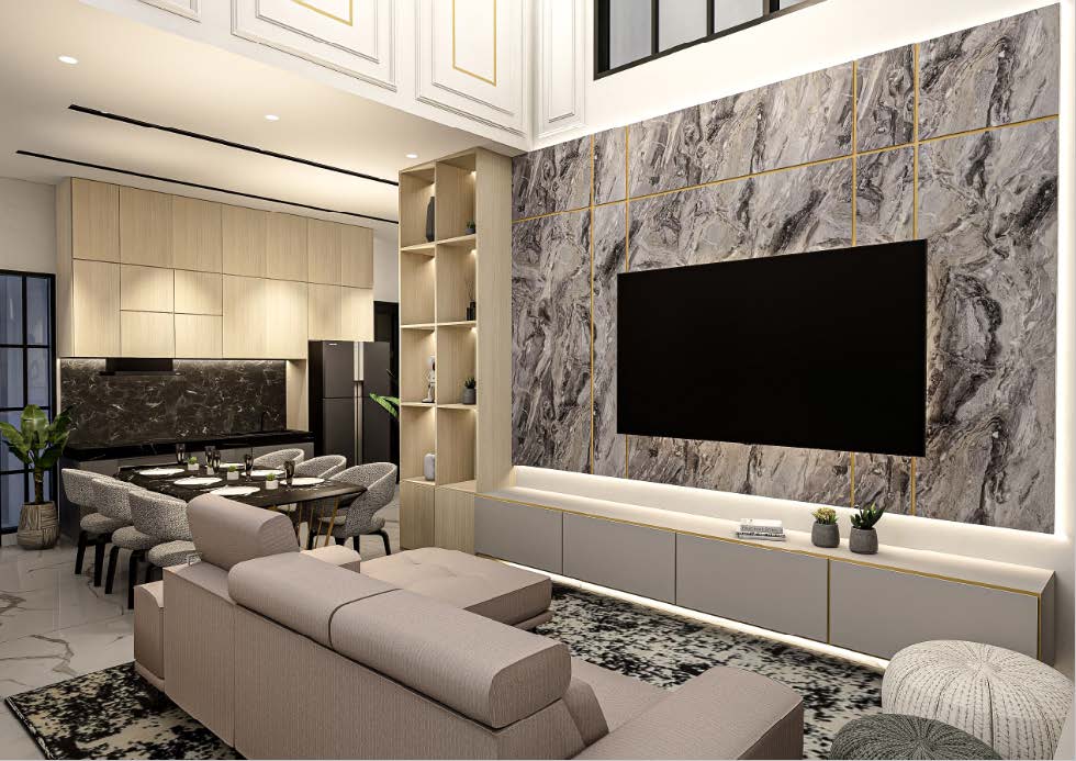 Interior spaces are meticulously curated to balance opulence with modern functionality. The heart of the home features a double-volume living area that emphasizes spatial openness, enhanced by a striking marble-clad feature wall and integrated shelving. The design utilizes a sophisticated material palette, combining deep black marble, warm wood veneers, and gold-inlaid wall moldings to create an atmosphere of refined luxury.